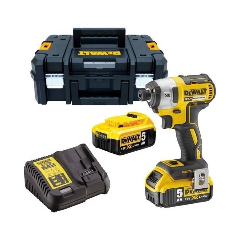 Cordless impact driver DeWalt DCF887P2-QW 18V Features and benefits: • PrecisionDrive technology protects screws and products from overturning. •New generation compact impact driver with new XR Lithium Ion technology. • Brushless motor - longer operating time and infrequent maintenance. • Smart XR Lithium Ion series for a more efficient and faster work. • Extremely compact and lightweight, suitable for hard-to-reach areas. • Improved ergonomic design and a more comfortable rubber coated handle. • Aluminium front part of the tool ensures better heat dissipation and prolongs tool service life. • 3 LED lights with delay function ensure excellent visibility. The set includes: • 2 x 5 Ah Li-Ion batteries • Charger • Case TSTAK
