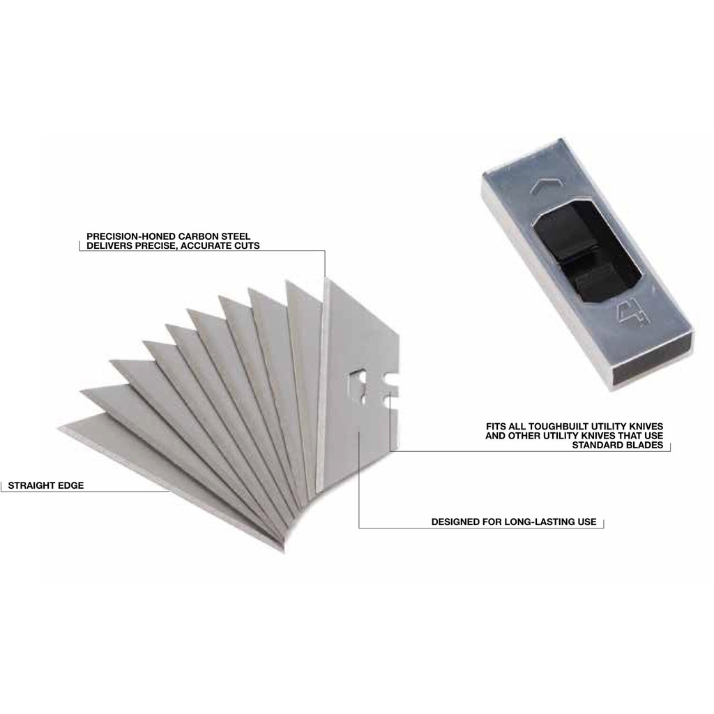 ToughBuilt® Utility Knife Blades keep your utility knife working optimally throughout the most rigorous jobs. Made from durable, precision-honed SK5 carbon steel to provide long-lasting use. The straightedge blades deliver precise and accurate cuts on a variety of materials including carpet, cardboard, drywall, leather, rubber, vinyl flooring and more.