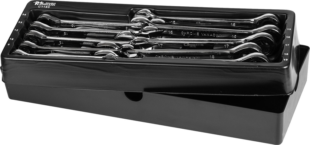 Allen keys in case. 72-tooth ratchet mechanism, keys made of Cr-V steel. Set includes 8; 10; 12; 13; 14; 15; 16; 17; 18; 19mm