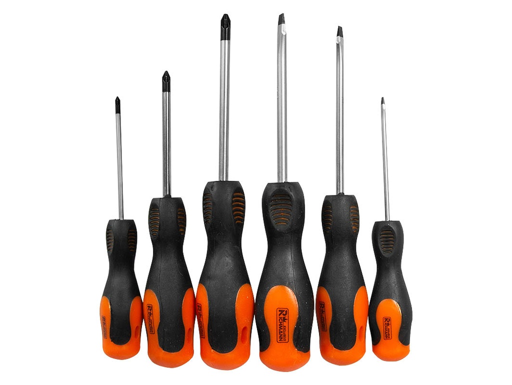 Screwdriver kit with two-component handles. Chrom vanadium steel. PH or PZ crosses, depends on the kit. 0x75; 1x75; 2x100 and plane 3x75; 5x100; 6x100