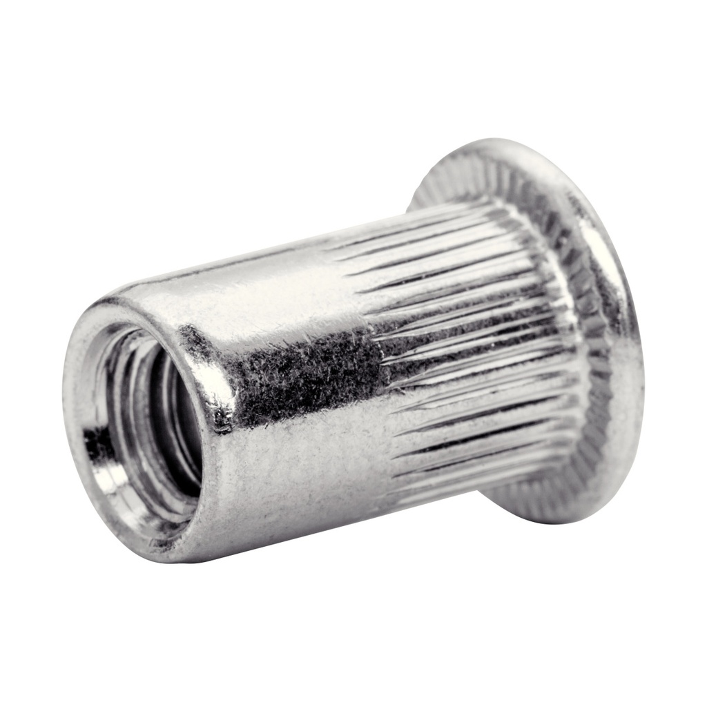 Rapid steel knurled rivet nuts. Knurled rivet nuts are flat-ribbed to prevent twisting inside the hole. Special diameter metal drill included.